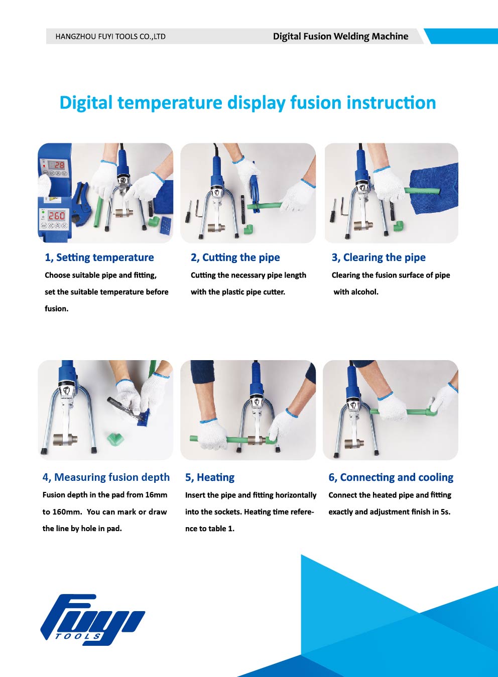 Sådan bruger du digital socket fusion svejsemaskine 1. Indstilling af temperatur Vælg passende rør og fittings, indstil den passende temperatur 2. Skæring af røret Skæring af den nødvendige rørlængde med plastrørskæreren. 3. Rengøring af røret Rengøring af rørets smelteoverflade med alkohol 4. Måling af fusionsdybde Fusionsdybde i puden fra 16 mm til 160 mm. Du kan markere eller tegne stregen for hul i puden. 5. Opvarmning Sæt rør og fitting vandret ind i muffer. Opvarmningstid reference til instruktionsbog i sættet. 6. Tilslutning og afkøling Tilslut det opvarmede rør og fitting nøjagtigt og juster finish på 5s.